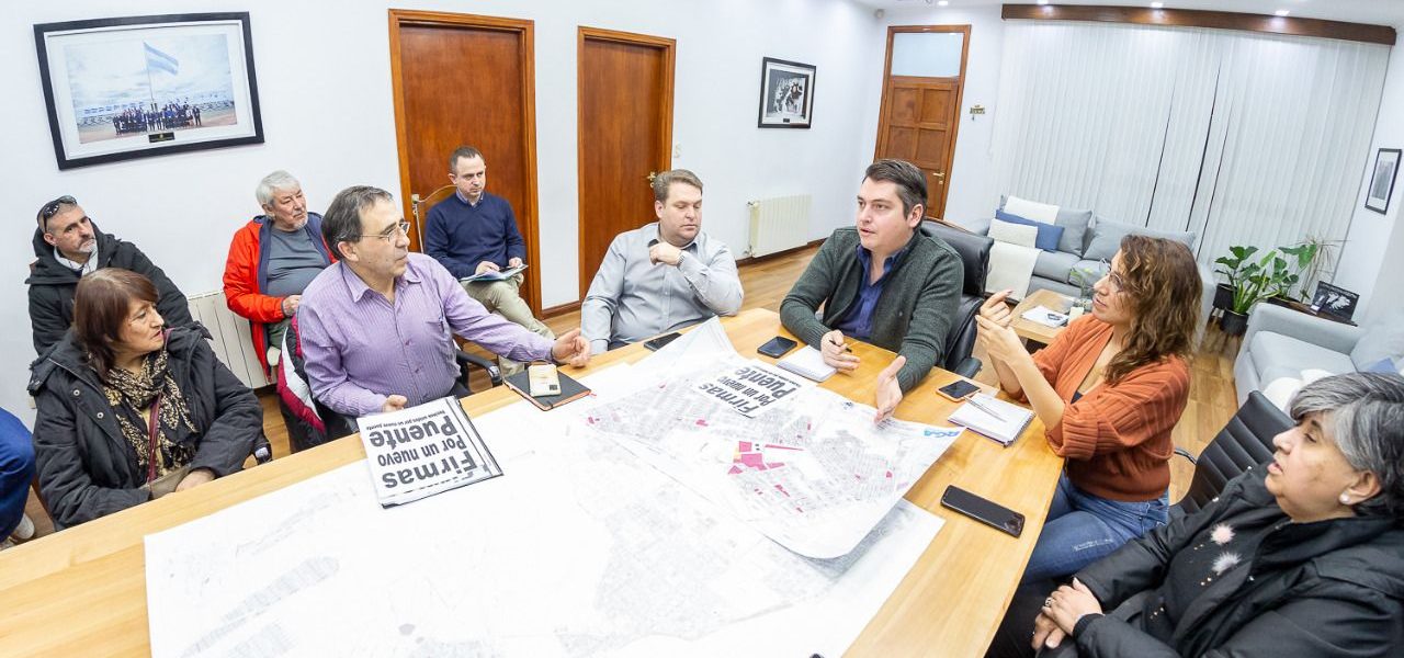 El intendente Martín Perez, junto al presidente del Concejo Deliberante, Raúl Von der Thusen, Silvina Mónaco, a cargo de la carteras de Obras Públicas, Gastón Díaz, secretario de Gobierno, recibieron a vecinos de distintos barrios quienes llevan adelante la mencionada campaña, para dialogar sobre las gestiones que tienen como fin la construcción de un nuevo puente para la ciudad de Río Grande.
