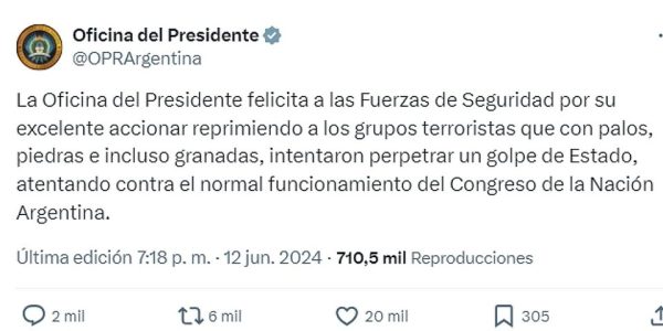 La Oficina del Presidente publicó un tuit en el que saludó la represión de las fuerzas de seguridad en las inmediaciones del Congreso y se refirió a los manifestantes como «grupos terroristas» que buscaban «perpetrar un golpe de Estado». El…