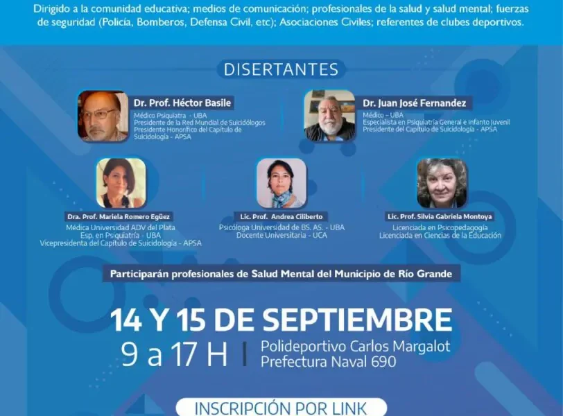 El Municipio de Río Grande, junto a la Asociación de Psiquiatras de Argentina, llevará a cabo el Curso de Formadores en Prevención de Suicidio. Será los próximos 14 y 15 de septiembre en el Polideportivo Margalot, donde disertarán profesionales de relevancia nacional pertenecientes al Capítulo de Suicidología de la Asociación de Psiquiatras de Argentina como así también del equipo de la Dirección General de Salud Mental y Adicciones.