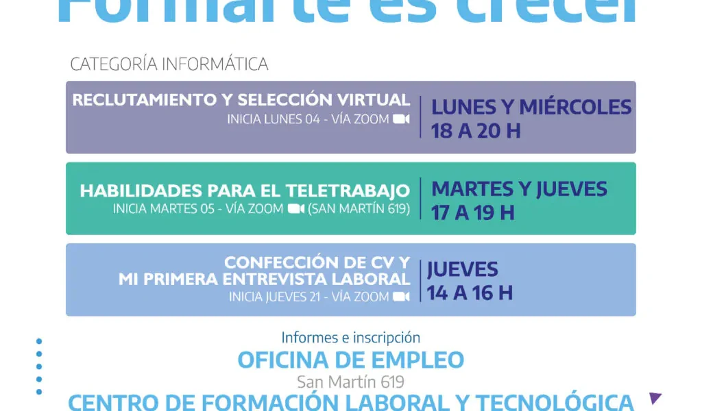 En septiembre darán inicio nuevos cursos y talleres del Programa Municipal “Formarte es Crecer”, correspondientes a la categoría informática, tales como Reclutamiento y Selección Virtual; Habilidades para el Teletrabajo; Confección de CV y Mi primera entrevista laboral.