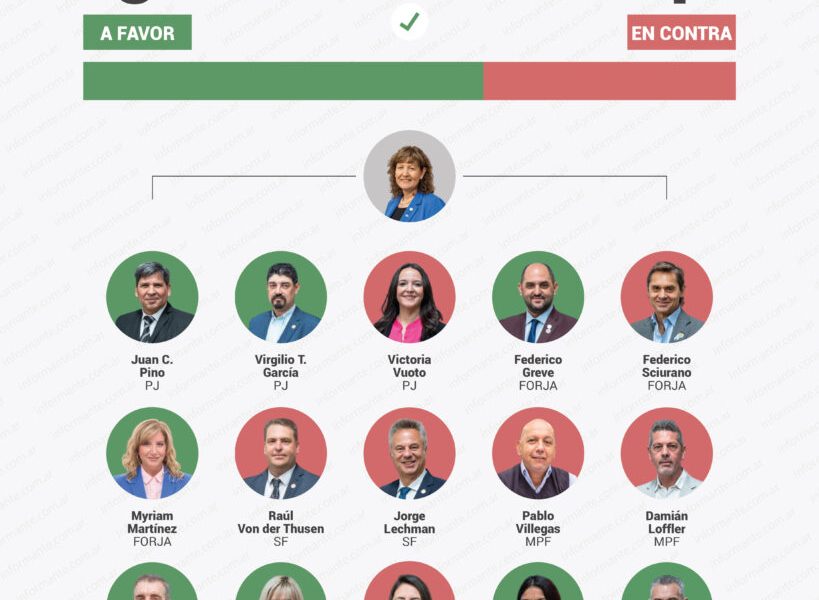 Votaron a favor Juan Carlos Pino y Virgilio García (PJ), Federico Greve y Myriam Martínez (FORJA), Luciano Selzer y Natalia Gracianía (La Libertad Avanza), Gisela Dos Santos (Sumemos Tolhuin) y Matías Lapadula (Provincia Grande).